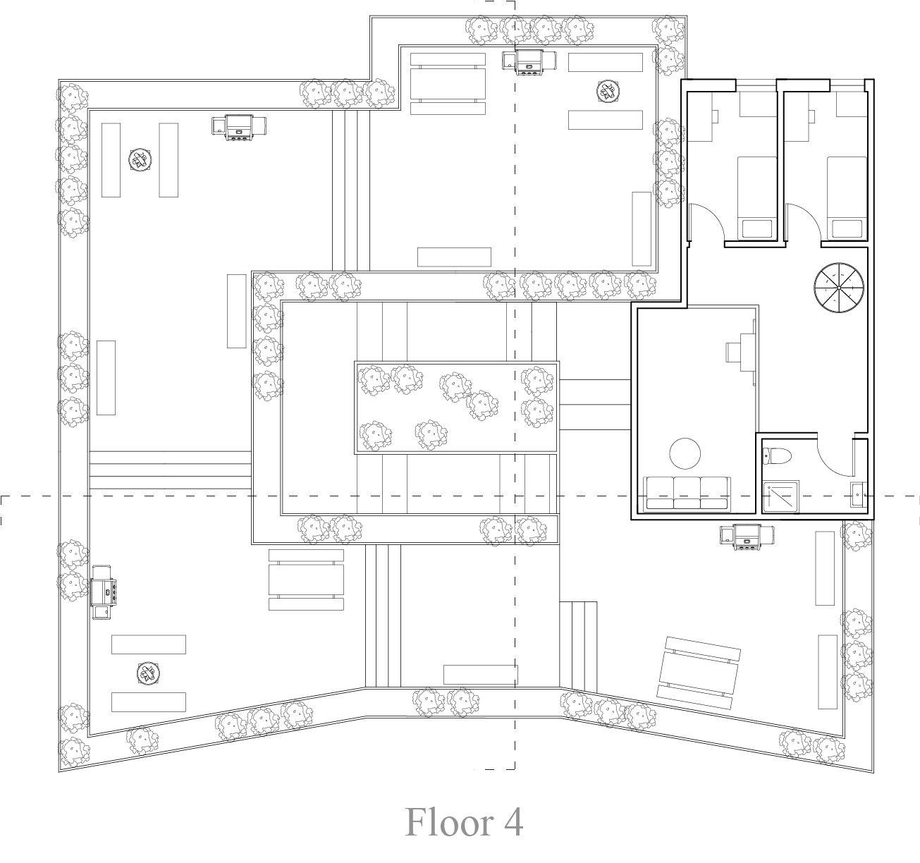 This library also acts as a public garden, with community garden boxes outside and inside the building. The glass courtyards bring the outdoors indoors, and are also offset vertically. This allows for the tree planted in the children’s area on the first floor to enter the courtyard in the auditorium on the second floor. As can be seen in the third graphic on page 11.