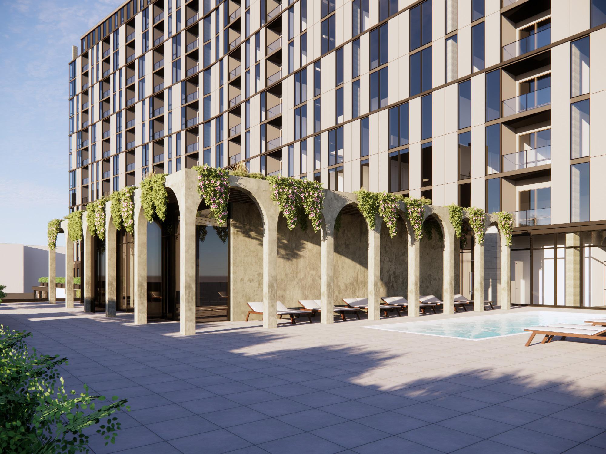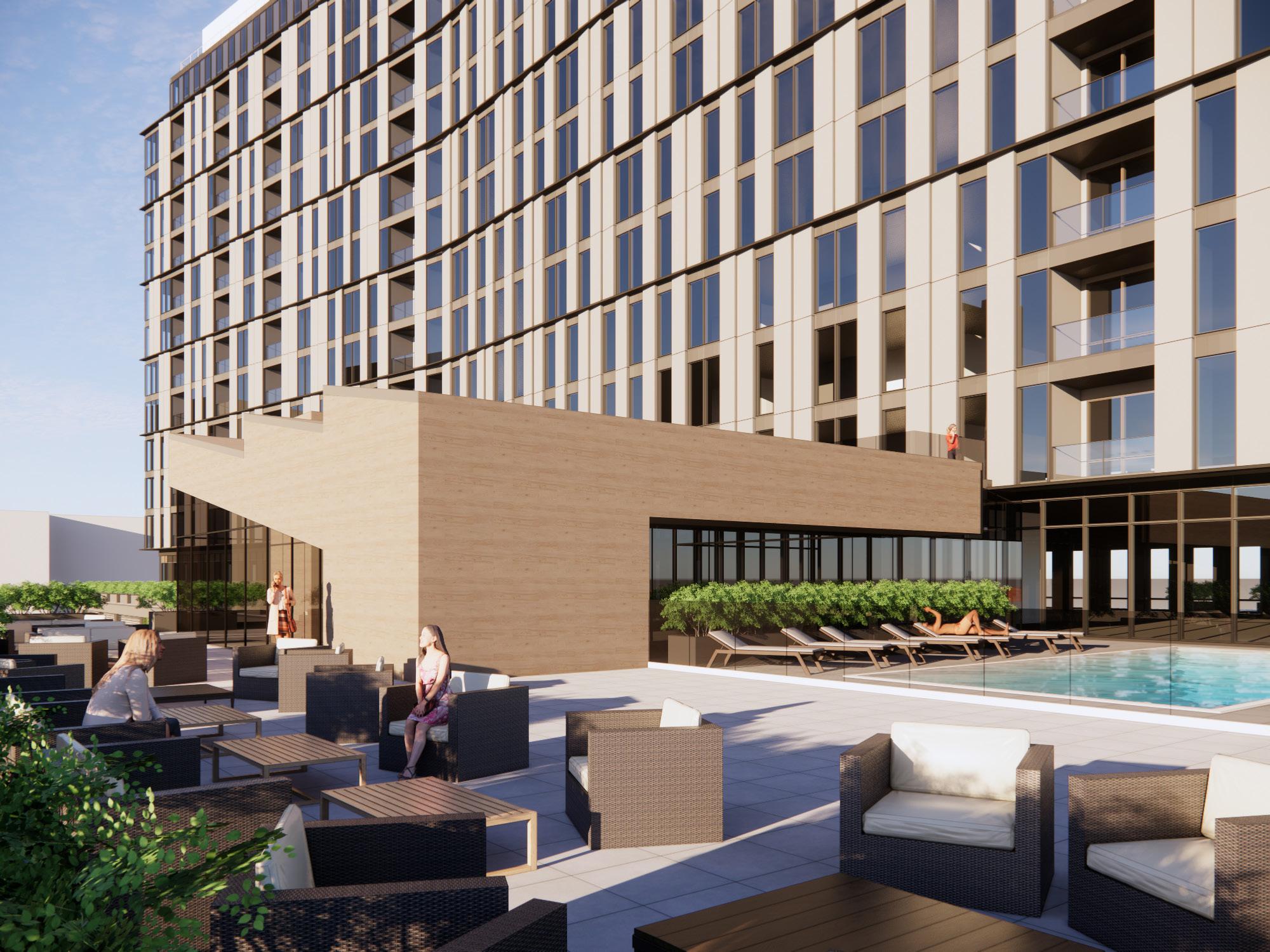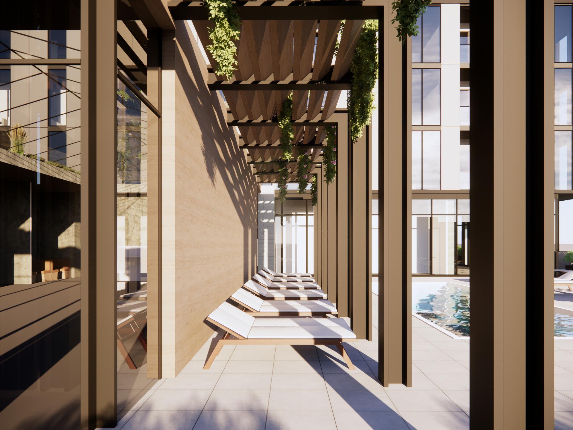 The space in which I was able to experiment the most with design and 3D modeling is the amenity pavilion. It is an area that protrudes from the tower into the large open space above the podium, an attraction for the residents. I created many different iterations for this pavilion that were presented to the client. I modeled in Revit and used Enscape to capture views.