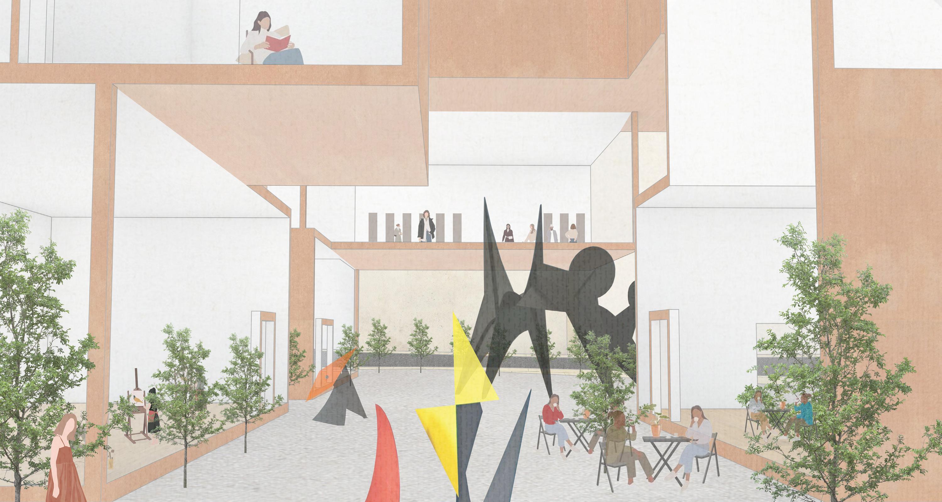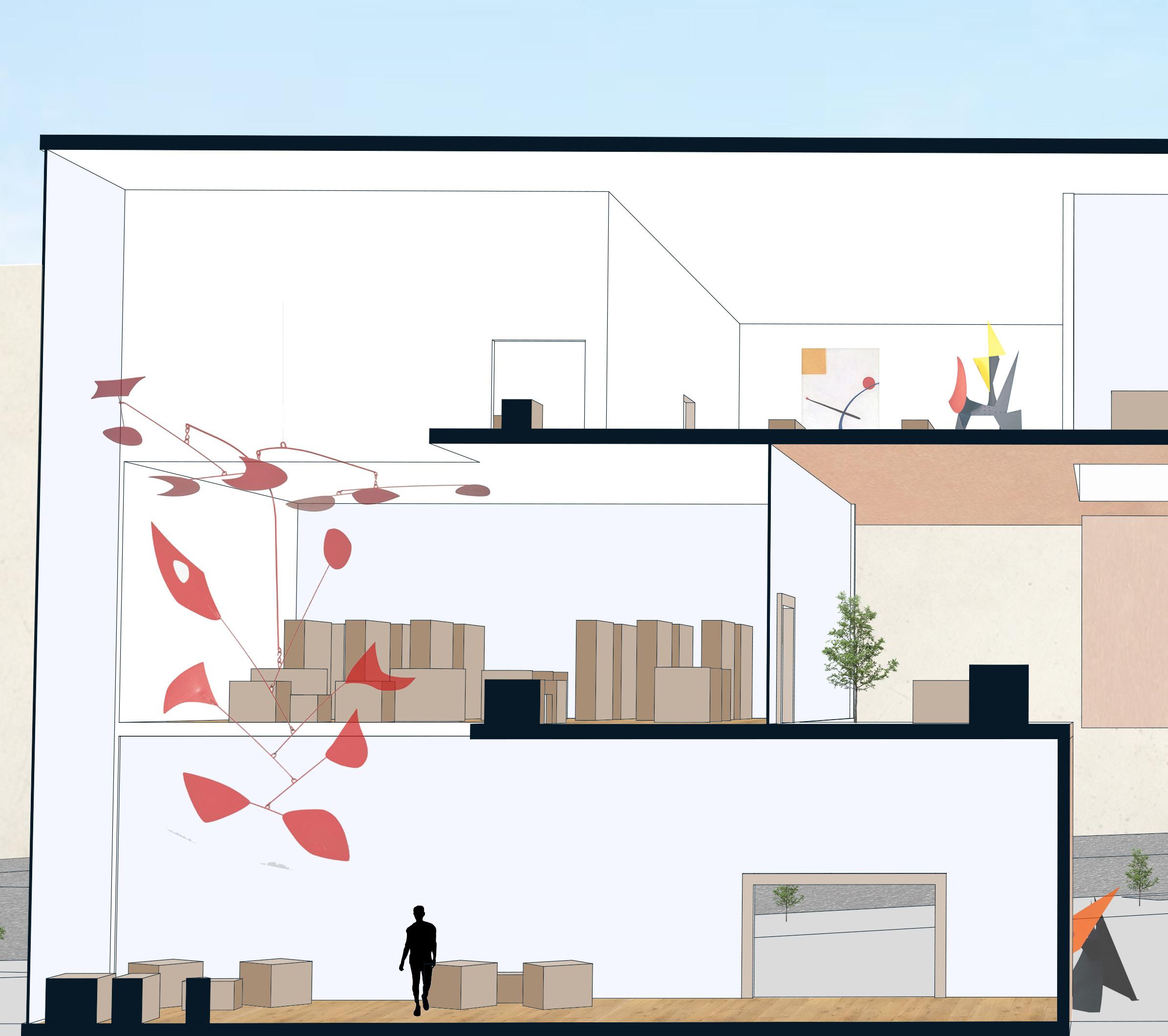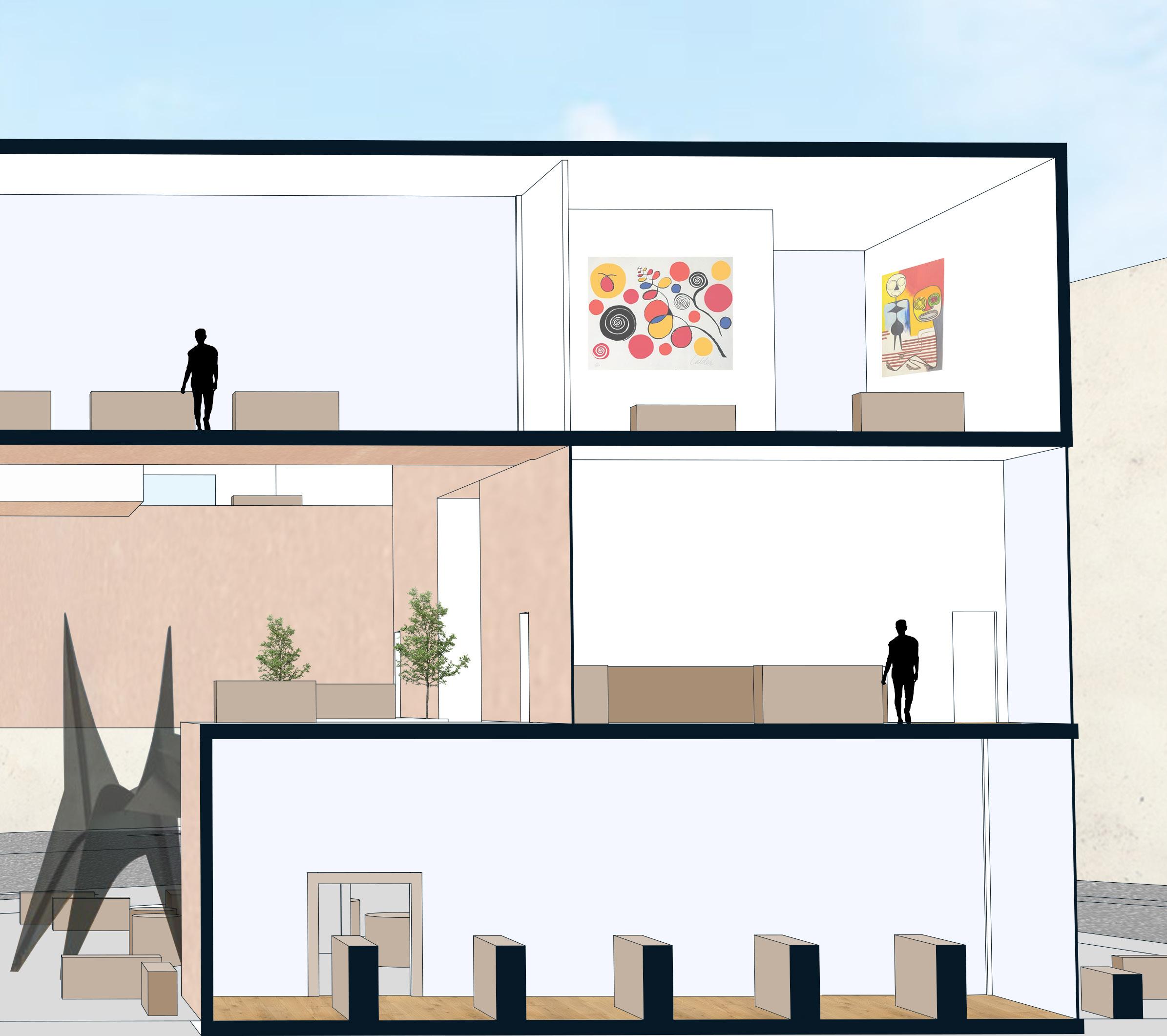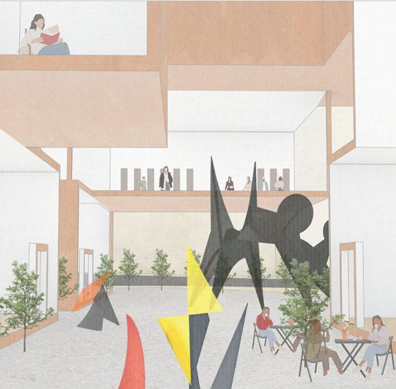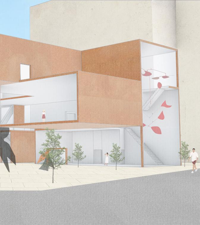 The architecture of the exhibition is tailored to Calder, with tripleheight spaces to display his largest mobiles. Additionally, the outdoor spaces and center courtyard are perfect for roaming around sculptures. Large floor-to-ceiling windows display the art to passersby and allow the legs to feel connected while remaining separate. The physical models I created for this project are laser cut, and the site is foam made from a CNC milling machine.