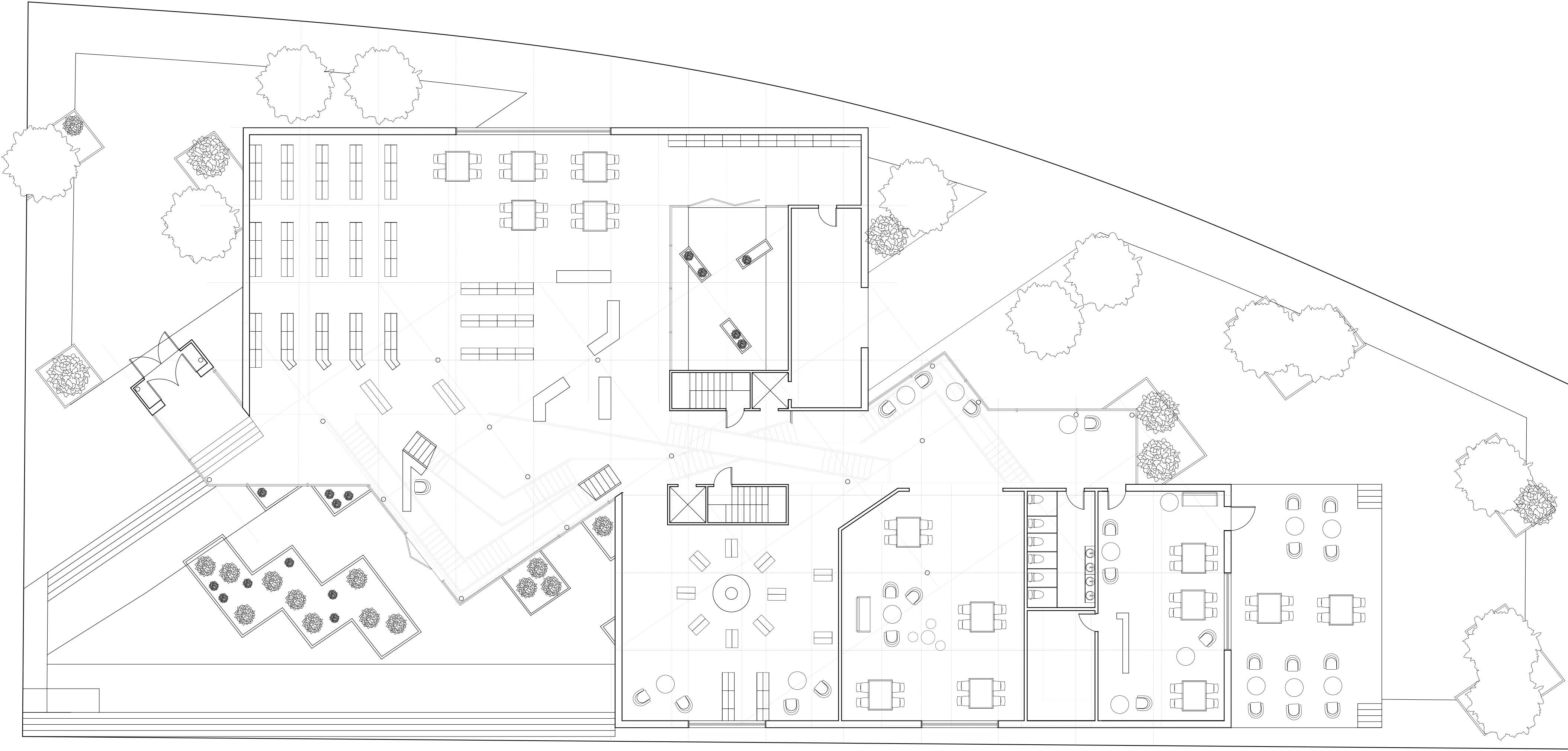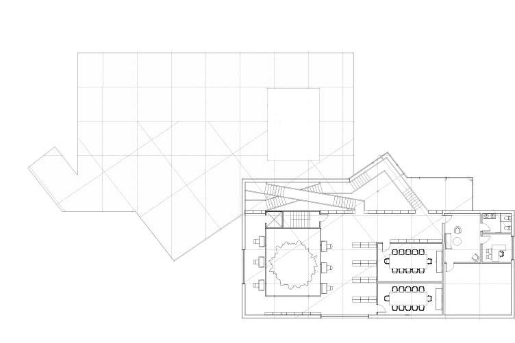 The building begins as three separate spaces, the main lobby, an auditorium lobby/ café, and a public workshop. The three legs remain isolated as they move to the second floor, to the auditorium, private workshop, and library. The three separate areas unite on the third floor, where the main gallery is. The visitors then continue on a loop through the different gallery spaces, including outdoor terrace sculpture gardens. Despite the shifting nature of the project, there are cores of circulation in each leg.