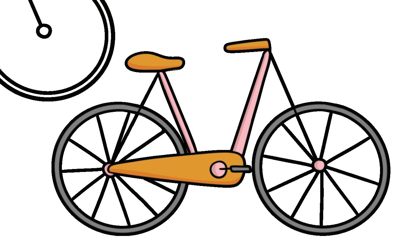Add spokes to the wheels, then color in the bicycle with orange, pink, and dark gray.
