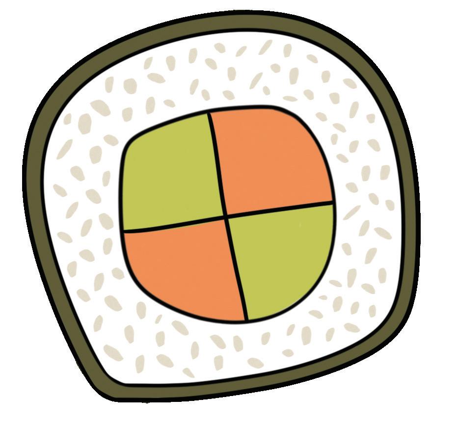 Draw a horizontal line in the center shape, then color it all in with orange and two shades of green. Add tan flecks to represent rice.