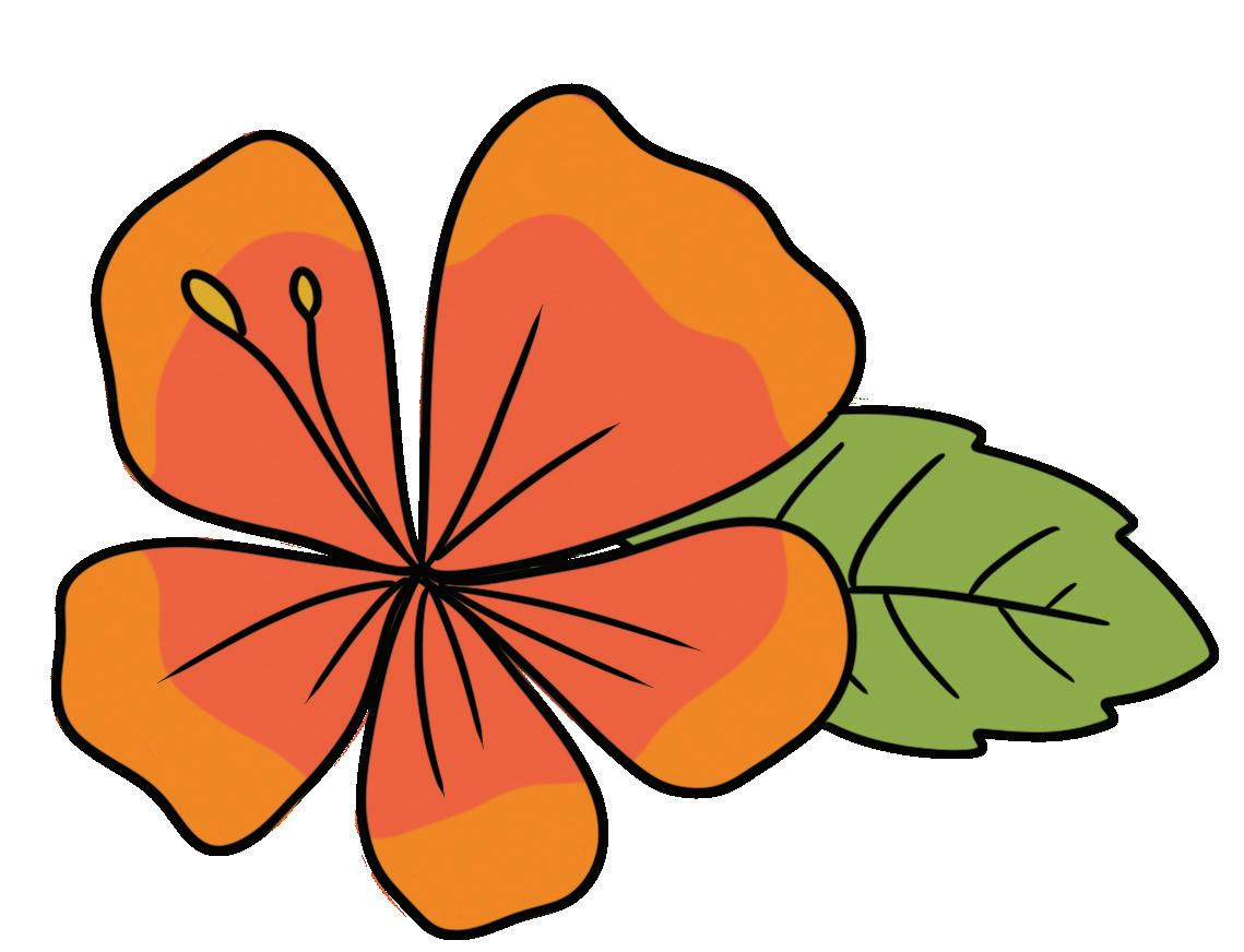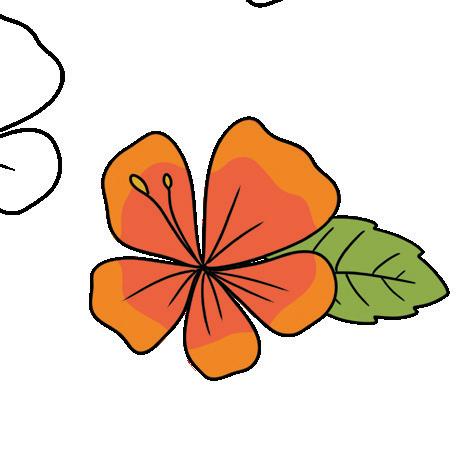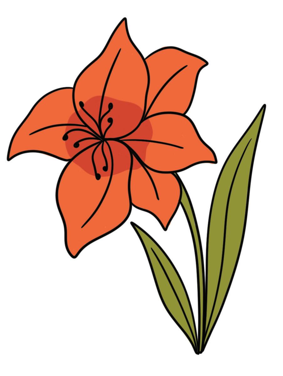 Add details to the flower. Then add two shades of orange to the petals and green to the stem and leaves.