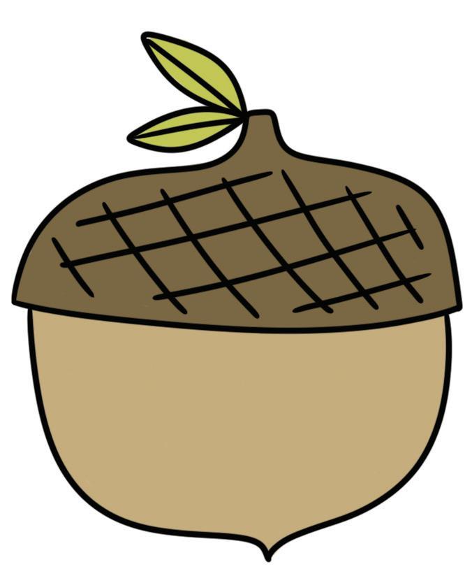 Add green leaves on top, then use two shades of brown to color in the acorn.