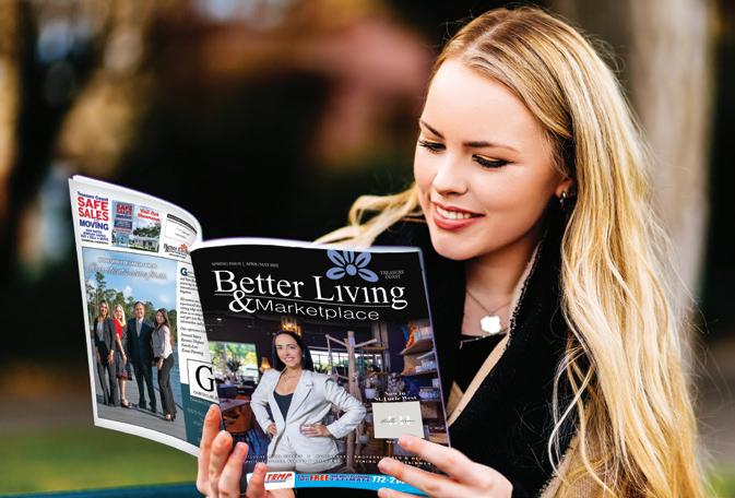 Better Living & Marketplace Magazine is published seasonally by Treasure Coast Communications and Marketing, Inc. Copyright 2022, all rights reserved. Reproduction of contents in print or electronic transmission in whole or in part in any language or format must be by express written permission of the publisher. All articles, descriptions and suggestions in this magazine are merely expression of opinions from contributors and advertisers and do not constitute the opinion of the publisher, editor or staff of Better Living & Marketplace Magazine, and under no circumstances constitutes assurances or guarantees concerning the quality of any service or product. Better Living & Marketplace Magazine specifically disclaims any liability related to these expressions and opinions. The advertiser agrees to hold harmless and indemnify the publishers from all liability. Letters from our readers are not only welcome but encouraged.