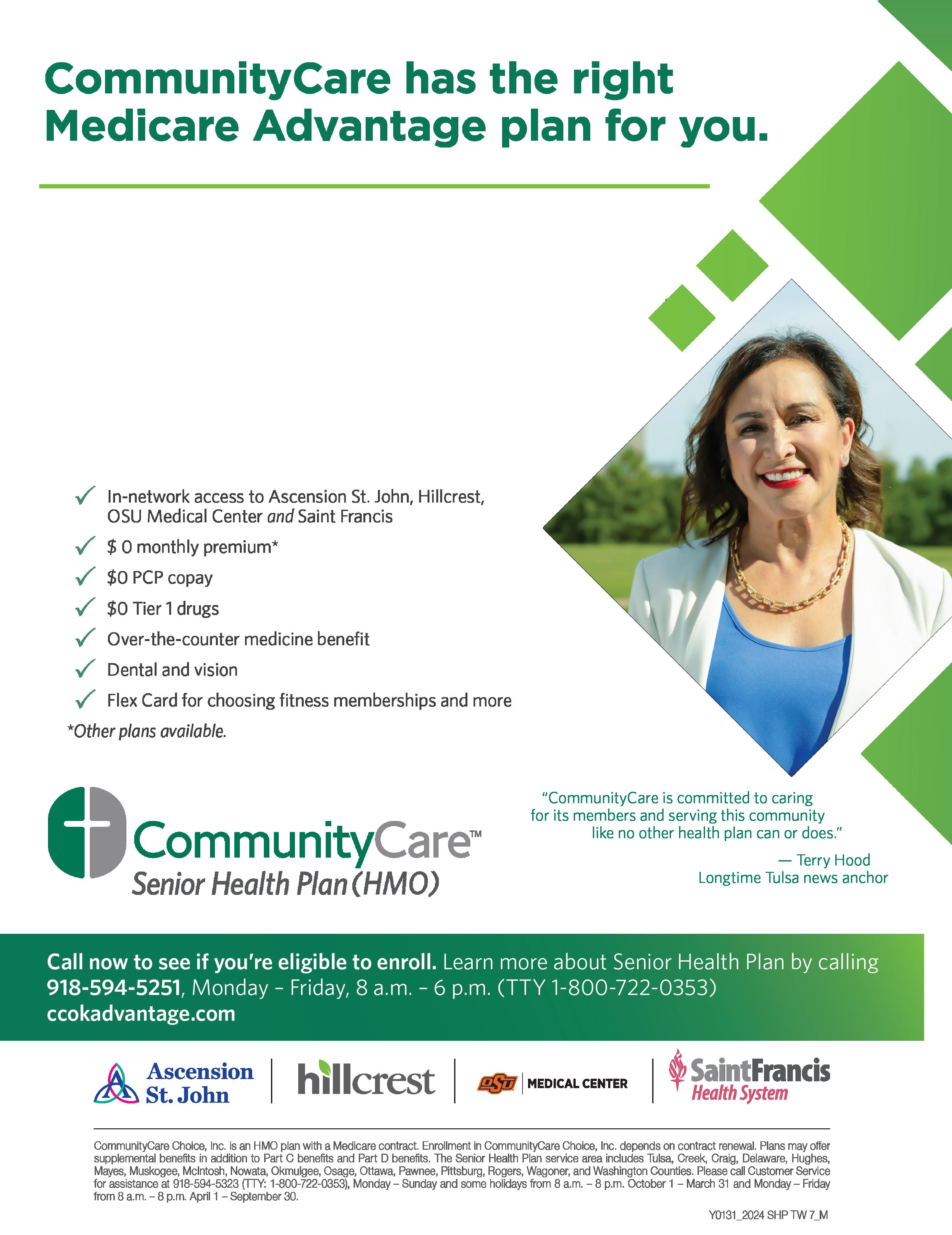 As Oklahoma’s largest locally owned health plan, CommunityCare offers you more—including innetwork access to the region’s four premier health systems, so you can choose the doctors, clinics, and hospitals you want (other providers are available in our network). And with our Senior Health Plan options, you’ll find the benefits you’re looking for in a Medicare Advantage plan, including: