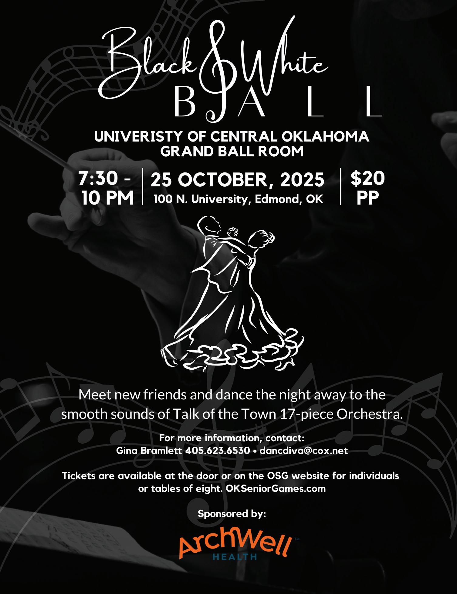OSG is hosting a Black and White Ball this year on Saturday, October 25. The event is from 7:30 to 10:00 pm featuring live music from Talk of the Town at The University of Central Oklahoma Grand Ballroom, 100 N University Drive, Edmond, OK 73034. The cost per person to attend is $20. For more information call: Gina Bramlett at 405-6236530, dancdiva@cox.net.