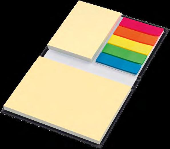 Notizbuch aus recyceltem Papier mit Ringbindung und farbigen Applikationen. 60 Blatt Inhalt, 70 g/m² Kugelschreiber aus Karton und Kunststoff, mit blau schreibender Mine. Im Polybeutel. Maße: 17,8 x 13,5 x 1 cm.