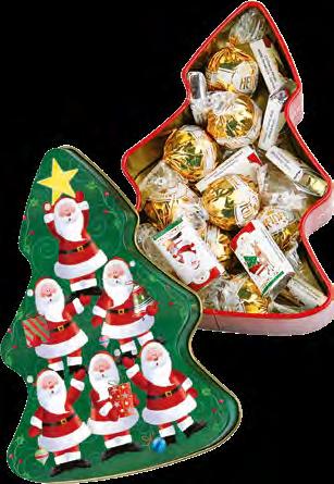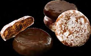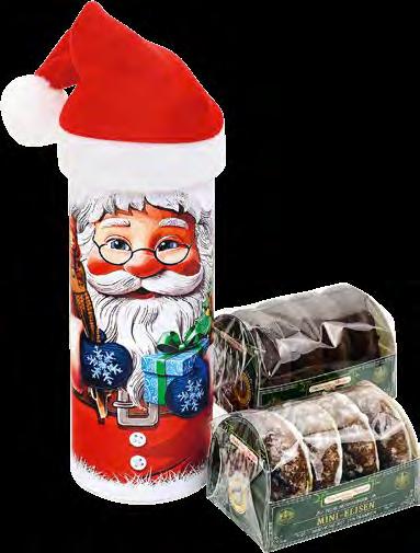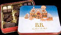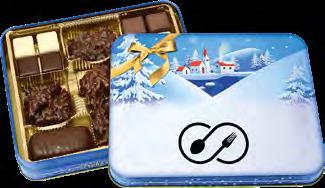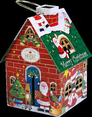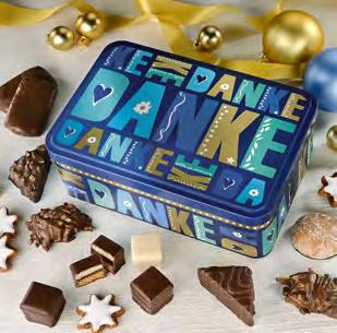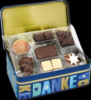 Winterlich illustrierte Präsentdose, gefüllt mit einer Lebkuchen-Gebäckmischung mit 20% Zartbitterschokolade, 4% Vollmilchschokolade und 4% weißer Schokolade.