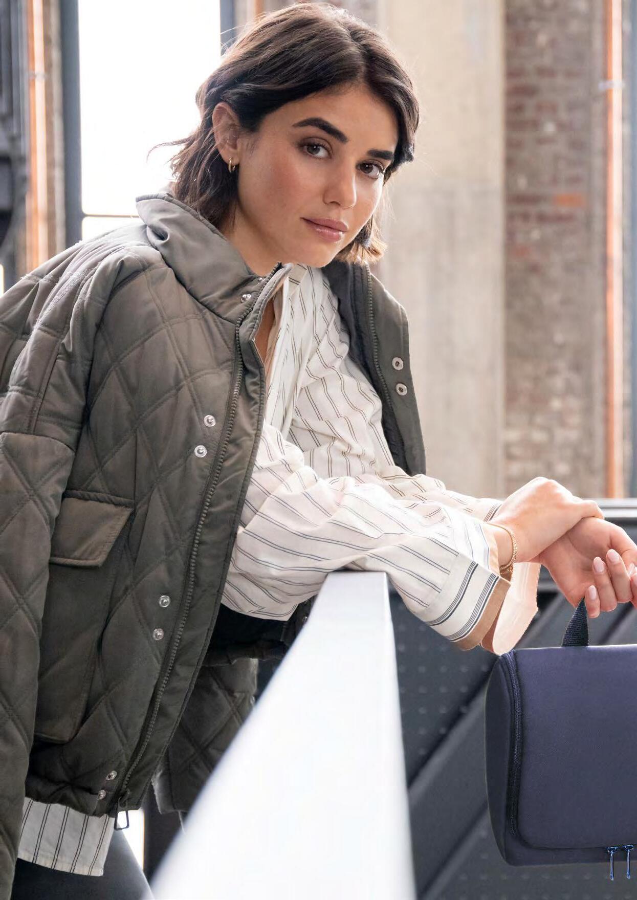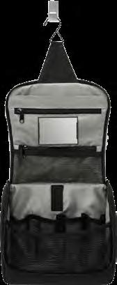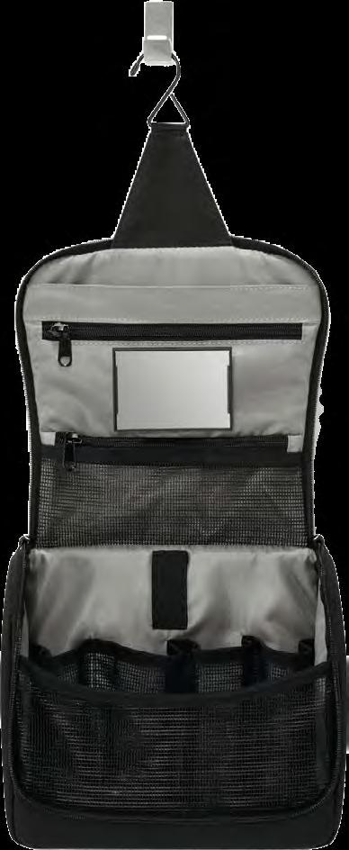 Aus hochwertigem, strapazierfähigem Nylon. Vier Stecktaschen aus Netzgewebe, zwei Reißverschlusstaschen, Spiegel und Bügelhaken zum Aufhängen.