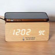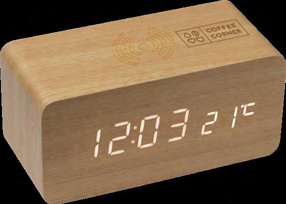 Stilvolle Tischuhr im modern-reduzierten Look, mit Wireless-Charger auf der Oberseite. Sie verfügt zusätzlich über eine Temperaturanzeige.