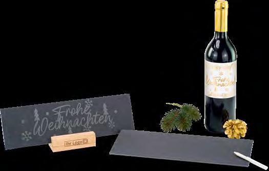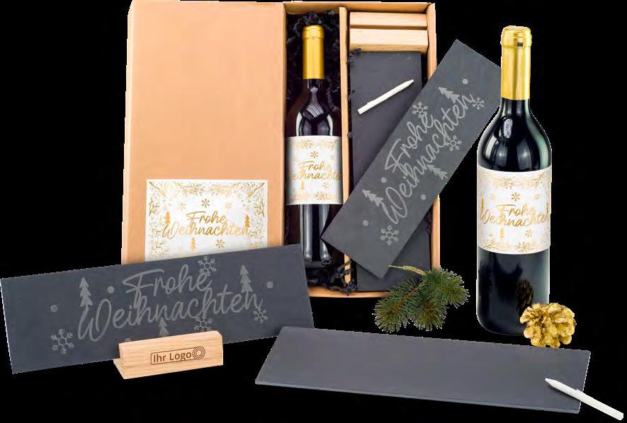 Edler Genuss, kombiniert mit einer persönlichen Botschaft. Hier trifft ein vollmundiger Cabernet Sauvignon (0,75 l) auf zwei dekorative Schieferplatten (ca. 30 x 9 cm) mit einem Holzständer.