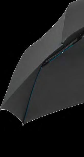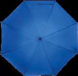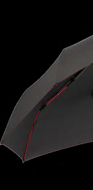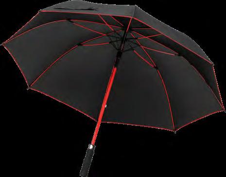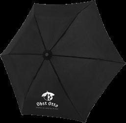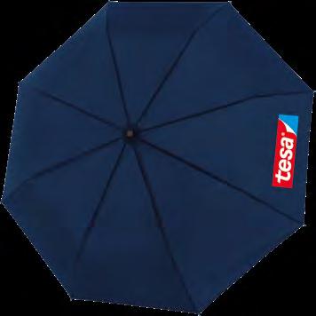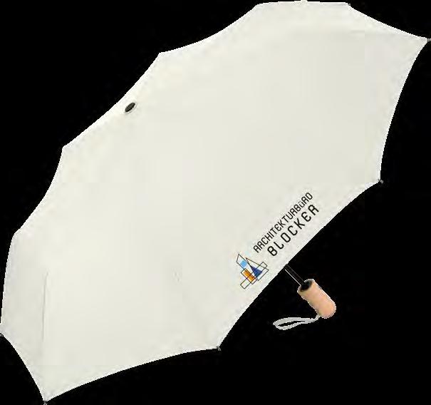 Silberne Auslösetaste zum Öffnen und Schließen. Mit sturmfestem Metallgestell. Inklusive farblich passender Hülle mit schwarzer Paspelierung und elastischer Kordel.