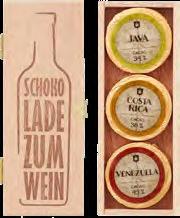 Klassische Holzkiste, gefüllt mit 6, 12 bzw. 45 Schokoladen-Golddublonen aus ausgewählten Kakaoplantagen der Welt. Die Kiste ziert der elegante Schriftzug „Schokolade zum Wein“. Die 8 g Golddublonen enthalten unterschiedliche Kakaoanteile. Die Variationen erstrecken sich von zarten Vollmilchsorten bis hin zu herberen Zartbittersorten - so ist für jeden Genießer das Richtige dabei! Maße: 45er Box: 13 x 20,5 x 3 cm, 12er Box: 12,5 x 8,5 x 2 cm, 6er Box: 4,8 x 12,5 x 2 cm.