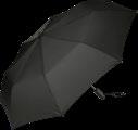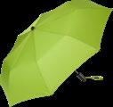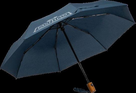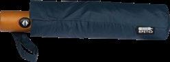 Handlicher Automatik-Taschenschirm mit Fiberglasgestänge, Bespannung aus recycelten PET-Flaschen, Holzgriff und Handschlaufe.