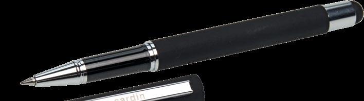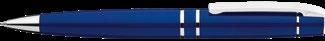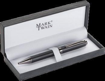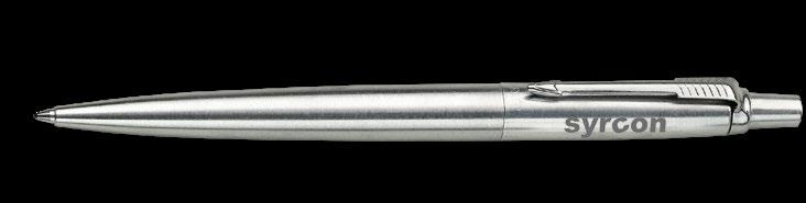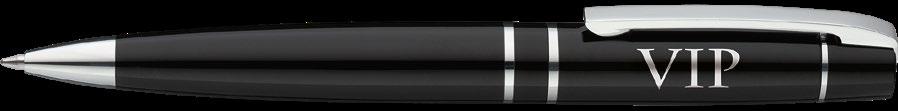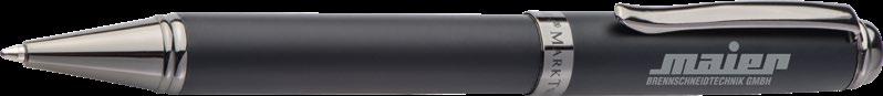Metall-Drehkugelschreiber mit Softdrehmechanik und gefedertem Clip. Beschlagteile glanzverchromt, bzw. schwarz glänzend. Blau schreibende Metall-Großraummine mit Edelstahl-Schreibspitze und Wolfram-KarbidKugel (1,0mm). Schreibleistung ca. 10.000 m.