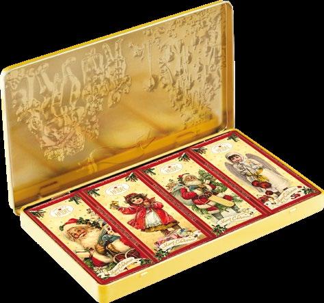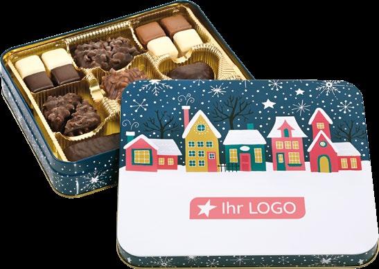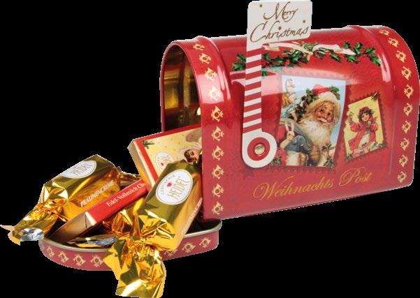 Schöne Metall-Präsentdose mit weihnachtlichem Motiv, gefüllt mit Vollmilch Chocolade und Chocopralinen mit feinster Nougatcremefüllung. Inhalt: ca. 124 g. Maße: 11 x 22 x 8 cm.