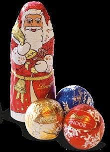 Edel gestaltete Verpackung gefüllt mit: einem Santa (Vollmilch, 125 g), und je drei Lindorkugeln in Milch und weißer Schokolade, sowie je zwei in Dunkel (60 %) und Haselnuss. Inhalt: 248 g. Maße: 19,3 x 12 x 4,8 cm.