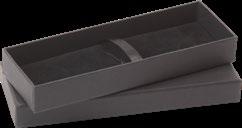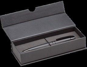 Schöner Drehkugelschreiber mit blau schreibender Metall-Großraummine. Das Metallgehäuse mit dunkel verchromten Applikationen verleiht ihm eine hochwertige Optik. Mit schwarzem Geschenketui. Material: Metall. Maße: 17,2 x 6,4 x 2,9 cm (Etui).