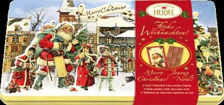 Feinste Edel-Vollmilchschokolade aus der Confiserie Heidel in einer schönen Nostalgie-Dose. Das Weihnachtsmotiv auf dem Deckel der Dose ist geprägt und hebt sich in einem 3D-Effekt ab. Im Inneren sind vier 30 g-Täfelchen leckerer Vollmilch-Schokolade enthalten (Kakaoanteil mindestens 37%).