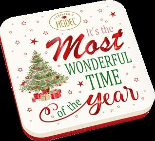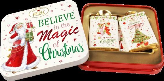 Liebevoll gestaltete Dose in zwei verschiedenen Designs („Believe in the Magic of Christmas“ und „It‘s the most wonderful time of the year“). Gefüllt mit Edel-Vollmilch Chocoladen-Täfelchen. Motive werden gemischt geliefert. Inhalt: 30 g. Maße: 10,2 x 10,2 x 1,7 cm.
