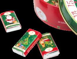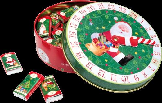 Runde Dose in weihnachtlichem Design, gefüllt mit 24 Edel-Vollmilch Chocoladen à 3 g. Und der Clou: Durch den beweglichen Zeiger auf dem Dosendeckel können Sie immer den folgenden Tag des WeihnachtsCountdowns markieren. Füllmenge: 72 g. Maße: Ø 12,2 x 4 cm.