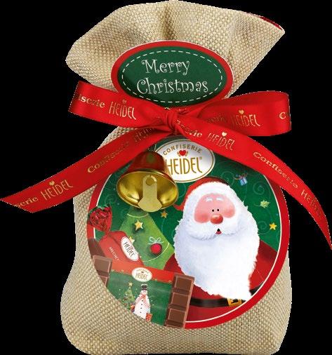 Jute-Geschenksäckchen mit Weihnachts-Etikett, verschlossen mit einer roten Schleife. Gefüllt mit Edel-Vollmilch Chocolade und Chocopralinen mit Milchcreme- und Pralinencremefüllung. Inhalt: ca. 159 g. Maße: 11 x 16 x 7 cm.