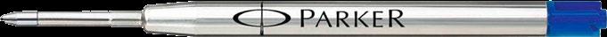 Oberteil aus Edelstahl, Unterteil aus Kunststoff. Original Parker Großraum-Metallmine, blau schreibend. Im Geschenkkarton.