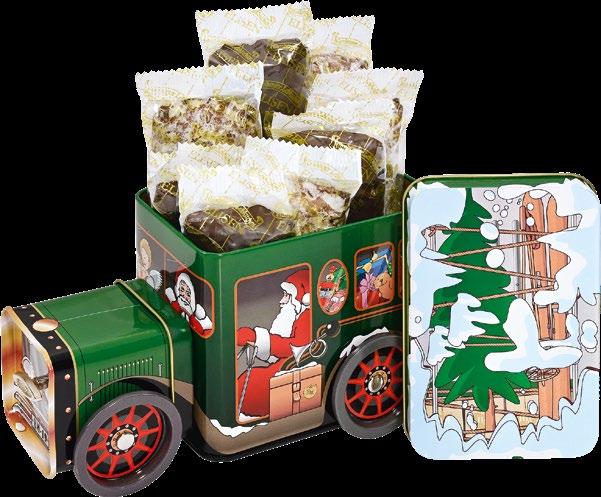 Metalldose mit eingebauter Spieluhr. Einfach an der Kurbel des Oldtimers drehen und schon ertönen weihnachtliche Klänge. Innen verbergen sich 200 g feinste Elisen-Schnitten. Maße: 9 x 18 x 10 cm.