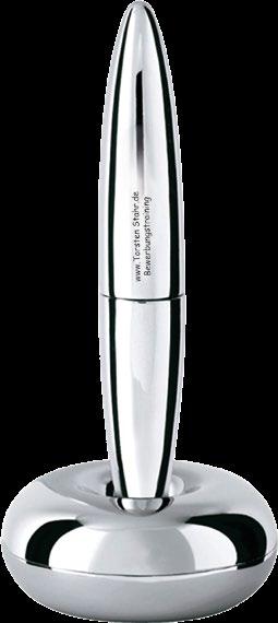 Der Kugelschreiber wird in den Magnethalter gestellt und dort „wie von Geisterhand“ festgehalten. Der massive Magnethalter fungiert gleichzeitig als Briefbeschwerer. Beide Teile aus verchromtem Metall, blau schreibende Metallmine. Maße (aufgestellt): Ø 5,5 x 12,5 cm. Im Geschenkkarton.