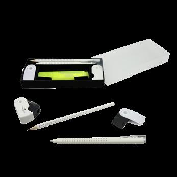 Dieses Set vereint alles, was nicht nur im Büro benötigt wird. Dokumentenechtes Schreiben mit dem hochwertigen Druckkugelschreiber Grip 2022. Dazu der Bleistift Grip 2001 in ergonomischer Dreieckform. Der Radierer (PVC frei) und der Spitzer Sleeve Mini komplettieren das Set mit dem nachfüllbaren Textliner mit Superleuchtkraft. In einer Geschenkverpackung mit transluzentem Schuber. Maße: 18 x 8 x 2,5 cm.
