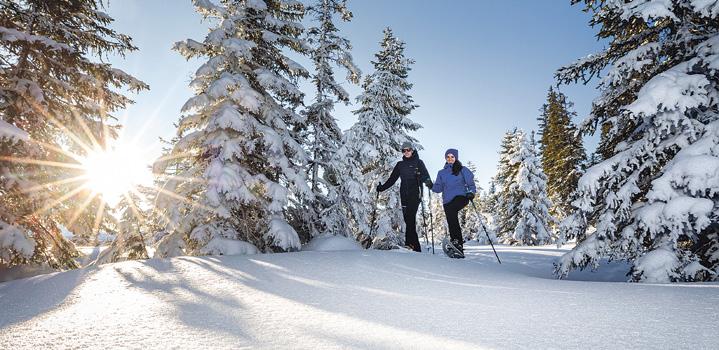 Im März schließlich beginnen die Win tersonne-Wochen: glitzernder Pulver schnee, märchenhafte Wälder und eine bestechende Fernsicht auf die Berge –die Wintersonne macht es möglich.