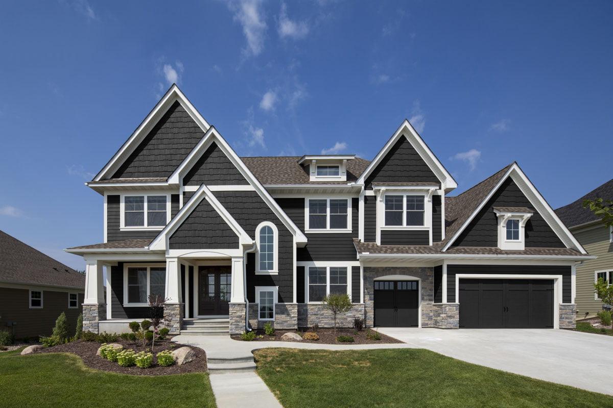 White with Black garage door, lap siding with board and batten accent and stone below