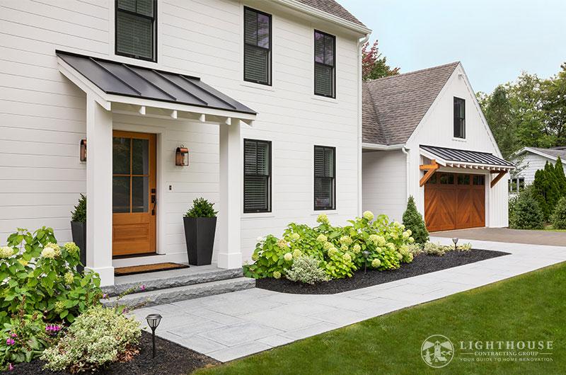 Arctic White with white trim, wood accents, black metal standing seam roof