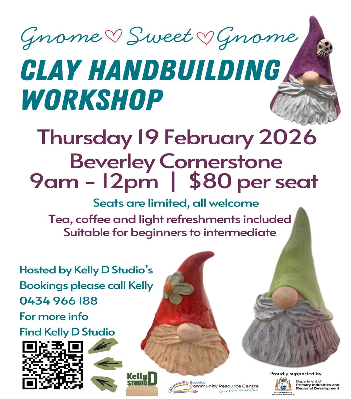 Join Kelly D and Bec as they guide you every step of the way to ensure you walk away with a clay gnome creation you’re proud of. It’s the perfect way to spend a morning being creative and meeting new friends. Ready to play with clay? Then book now for Thursday 19 February from 9am - 12pm, $80 per person includes materials and equipment, tea, coffee and light refreshments. Bookings please call Kelly 0434 966 188.