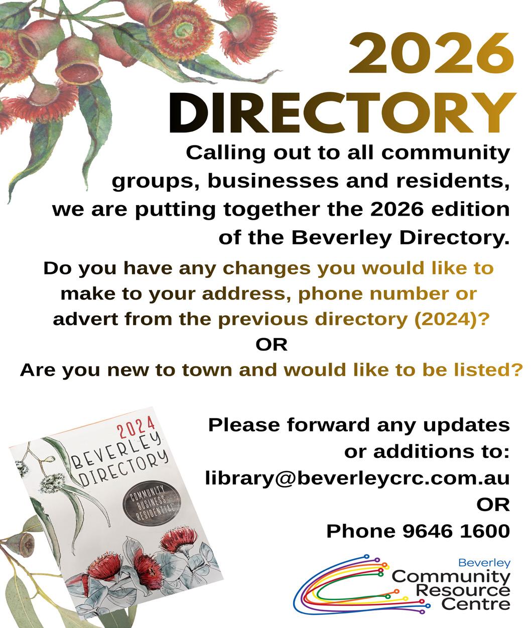The Beverley CRC, Library and the Visitor Centre will be closed on Monday 26 January 2026, for the Australia Day public holiday. For the Centrelink and Services Australia customers, you can access the free DHS Customer WiFi 24/7 for services.