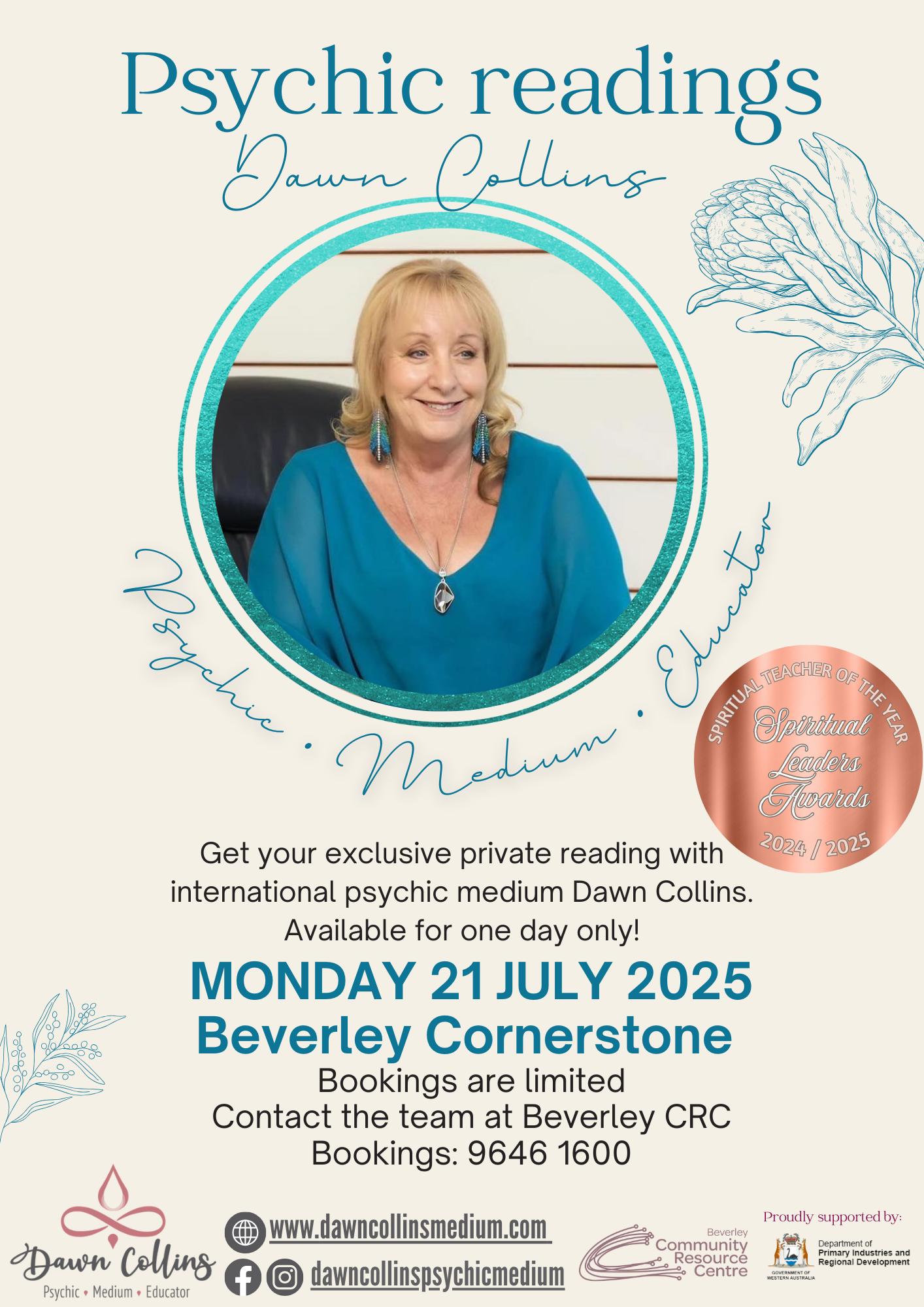 Awakening the Soul workshop Sunday 20 July at the Cornerstone building and private readings on Monday 21 July. Bookings are essential and can be made at the CRC or online. Please call our staff on 9646 1600.