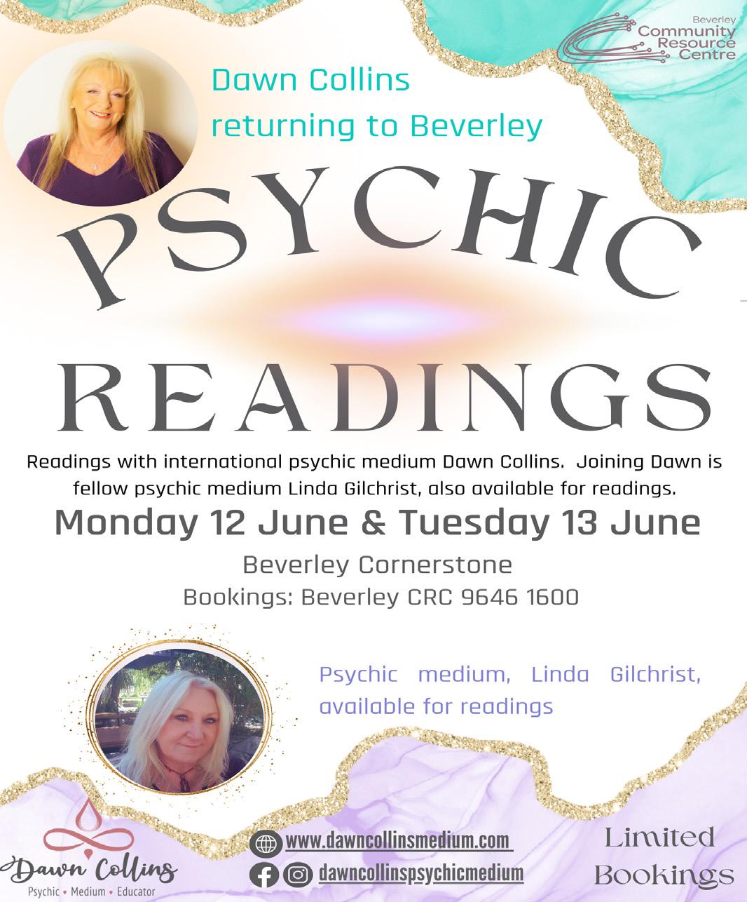 We have international psychic medium Dawn Collins returning to Beverley for private readings on Monday 12 & Tuesday 13 June. Joining her for this visit is Linda Gilchrist, who is also available for readings. Spots are filling up fast so be sure to book now! Contact our team at Beverley CRC 9646 1600.