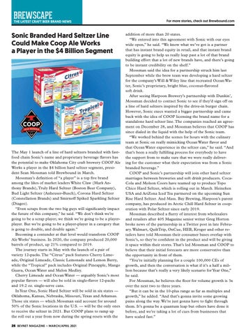 The May 1 launch of a line of hard seltzers branded with fastfood chain Sonic’s name and proprietary beverage flavors has the potential to make Oklahoma City craft brewery COOP Ale Works a player in the $4 billion hard seltzer segment, president Sean Mossman told Brewbound in March. Mossman’s definition of “a player” is a top five brand among the likes of market leaders White Claw (Mark Anthony Brands), Truly Hard Seltzer (Boston Beer Company), Bud Light Seltzer (Anheuser-Busch), Corona Hard Seltzer (Constellation Brands) and Smirnoff Spiked Sparkling Seltzer (Diageo). “Even scraps from the two big guys will significantly impact the future of this company,” he said. “We don’t think we’re going to be a scrap player; we think we’re going to be a playerplayer. But we’re going to be a player-player in a category that is going to double, and double again.” Becoming a contender at that level would transform COOP Ale Works’ business. In 2020, the company produced 20,000 barrels of product, up 21% compared to 2019. The journey starts in May with the launch of a pair of variety 12-packs. The “Citrus” pack features Cherry Limeade, Original Limeade, Classic Lemonade and Lemon Berry, while the “Tropical” pack includes Original Pineapple, Mango Guava, Ocean Water and Melon Medley. Cherry Limeade and Ocean Water — arguably Sonic’s most popular flavors — will also be sold in single-flavor 12-packs and 19.2 oz. single-serve cans. In Year One, Sonic Hard Seltzer will be sold in six states — Oklahoma, Kansas, Nebraska, Missouri, Texas and Arkansas. Those six states — which Mossman said account for around 50% of the Sonic locations in the U.S. — will be the only ones to receive the seltzer in 2021. But COOP plans to ramp up the roll out a year from now during the spring resets with the 26 BEVNET MAGAZINE – MARCH/APRIL 2021