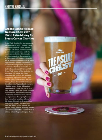 Green Flash to Release Treasure Chest 2017 IPA to Raise Money for Breast Cancer Charities Green Flash Brewing Co. has announced the lineup for its 2017 “Treasure Chest” fundraising program. This is the craft brewery’s 7th annual beer release and special event series to raise funds for breast cancer charities. This year, the new beer released for the program is an IPA brewed with passion fruit, and it will be available on-draft in 37 U.S. states, supported by a dynamic, on-premise, tiki-themed event program in key cities. Treasure Chest beer is available on draft in September and October 2017. Green Flash kicked off the fundraiser by hosting the 7th annual San Diego Treasure Chest Fest – a rare beer and food pairing experience at their Cellar 3 barrel-aging facility. For the 4th year running, Green Flash will host Treasure Chest Fest at its Virginia Beach brewery. Raising money for the fight against breast cancer is a cause that has an especially personal connection for the founders of Green Flash. Brewery Co-Founder, Lisa Hinkley is a breast cancer survivor and is passionate about giving back to those whose lives have been affected by this disease. Through the Treasure Chest program, the brewery has raised over $300,000 dollars for our national and regional charity partners including Prevent Cancer nationally and the Susan G Komen affiliates in San Diego and Virginia Beach.