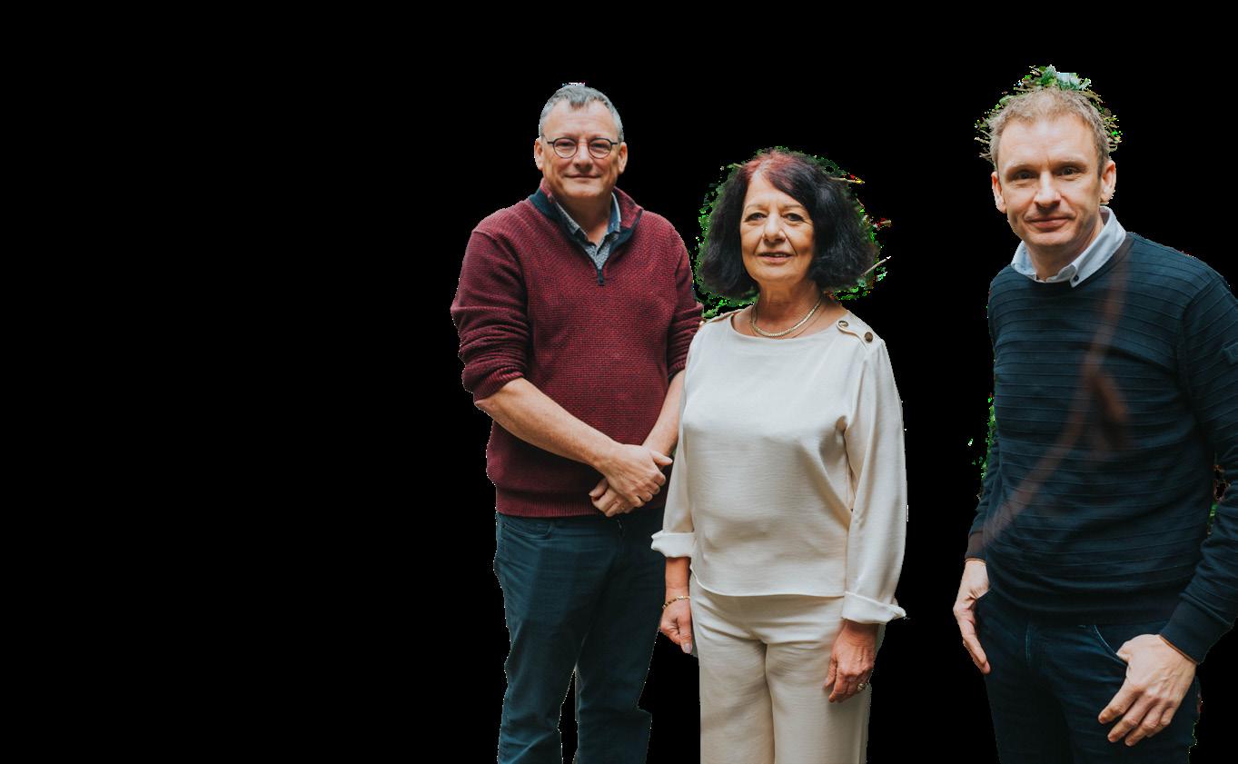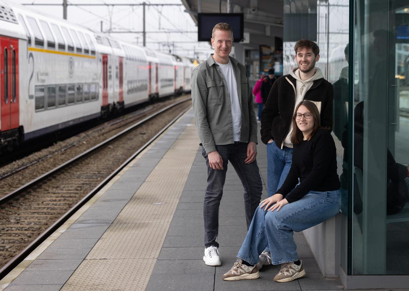 < UCLL-studenten Maarten Mignolet (links) en Matthias Daenen (rechts) werken mee aan het project ‘Mobiliteit in Limburg’, samen met Silken Rutten van ACV (zittend).