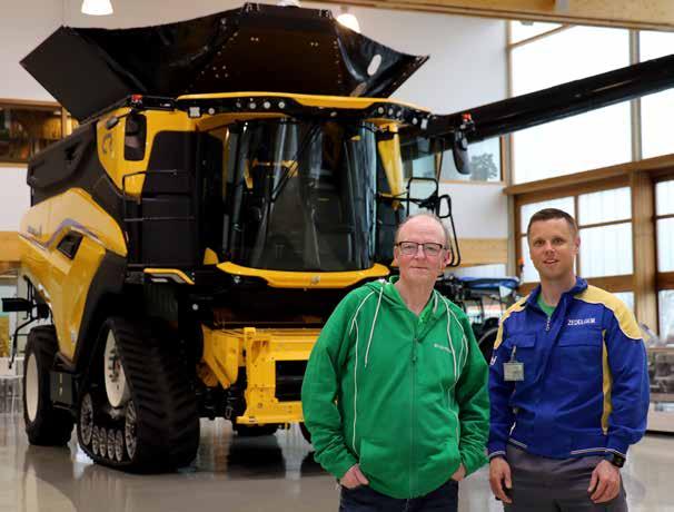 Geert Blieck, gewezen ACV-hoofdafgevaardigde bij CNHi, naast kersvers ACV-hoofdafgevaardigde Jorgé Oorlynck bij het gloednieuwe model maaidorser dat men dankzij het toekomstpact vanaf volgend jaar in Zedelgem zal produceren.