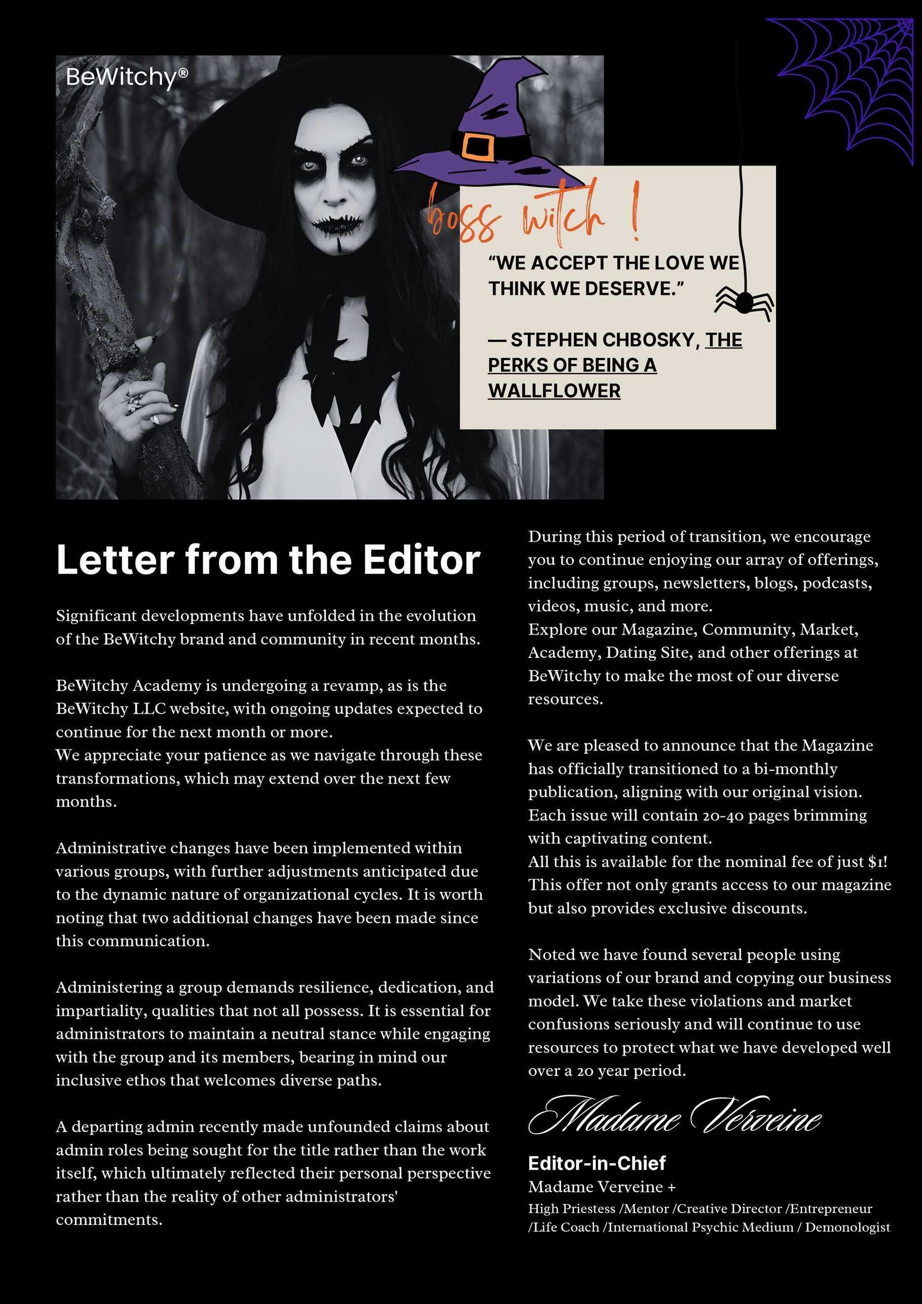 As the seasons shift and the moon waxes full, we invite you to embark on a journey of magic, mystery, and wonder. Within these pages, discover the enchanting world of witchcraft, where ancient traditions meet modern practices. Stay connected with the BeWitchy community on social media, and share your thoughts, experiences, and magical moments with us using the hashtag #bewitchy # #BeWitchyMagazine