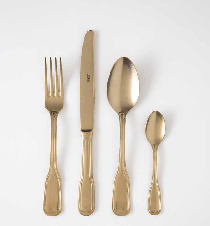 Our cutlery is coated with titanium nitride, a metal with exceptional density and hardness. Made in a vacuum almost like that of outer space, this coating gives the cutlery effective and long-lasting protection against accidental scratches, scuffs and stains that always end up appearing on the cutlery. It is practically as hard as sapphire, which is the hardest stone after diamond.