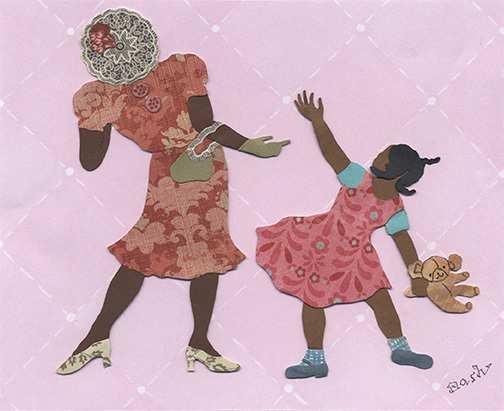Susan Dashiell, Grandma,Girl,Bear . Susan is a teacher living in Bloomfield, NJ who enjoys collaging during quiet moments.