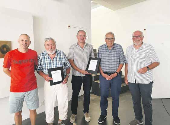 Von links: Philippe Hofmann, Präsident Verein Aargauer Namenbuch, Gerhard Tröndle, Stellvertreter des Bürgermeisters Ulrich Krieger der Stadt Laufenburg, Baden, Herbert Weiss, Stadtammann Laufenburg, Dieter Deiss, Rudolf Lüscher bei der Übergabe der veröffentlichten Schrift. Foto: Andrea Worthmann