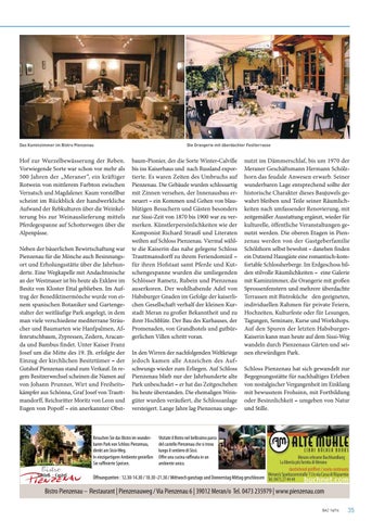 baum-Pionier, der die Sorte Winter-Calville bis ins Kaiserhaus und nach Russland exportierte. Es waren Zeiten des Umbruchs auf Pienzenau. Die Gebäude wurden schlossartig mit Zinnen versehen, der Innenausbau erneuert – ein Kommen und Gehen von blaublütigen Besuchern und Gästen besonders zur Sissi-Zeit von 1870 bis 1900 war zu vermerken. Künstlerpersönlichkeiten wie der Komponist Richard Strauß und Literaten weilten auf Schloss Pienzenau. Viermal wählte die Kaiserin das nahe gelegene Schloss Trauttmansdorff zu ihrem Feriendomizil – für ihren Hofstaat samt Pferde und Kutschengespanne wurden die umliegenden Schlösser Rametz, Rubein und Pienzenau auserkoren. Der wohlhabende Adel von Habsburger Gnaden im Gefolge der kaiserlichen Gesellschaft verhalf der kleinen Kurstadt Meran zu großer Bekanntheit und zu ihrer Hochblüte. Der Bau des Kurhauses, der Promenaden, von Grandhotels und gutbürgerlichen Villen schritt voran. In den Wirren der nachfolgenden Weltkriege jedoch kamen alle Anzeichen des Aufschwungs wieder zum Erliegen. Auf Schloss Pienzenau blieb nur der Jahrhunderte alte Park unbeschadet – er hat das Zeitgeschehen bis heute überstanden. Die ehemaligen Weingüter wurden veräußert, die Schlossanlage versteigert. Lange Jahre lag Pienzenau unge-