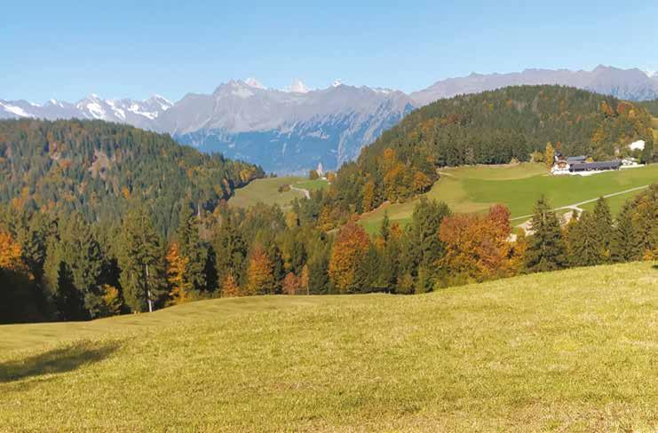 benstraße, die aufwärts führt, sind bereits die Hinweisschilder. Ganz kurz geht es die Straße aufwärts, dann zweigt unser Weg nach rechts ab, am Steinerhof vorbei erreichen wir wiederum die Vöraner Straße. Wir überqueren diese und entdecken sofort jenseits, beim „Grüß-Gott-in-Hafling“ – Schild den Wegweiser, der abwärts durch eine Wiese in den Wald führt. Durch Buchenwald in leuchtender Herbstfärbung geht es über eine Brücke und jenseits hinauf zu Wiesen. Unterhalb eines Pferdestalls wandern wir über freies Wiesengelände zu einem Aussichtspunkt mit Fernrohr.
