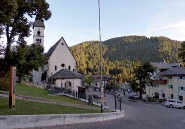 Auf der Dorfstraße erreichen wir das Zentrum mit dem Lisl-Peter-Altersheim. Gleich rechts ein rotes, altehrwürdiges Gebäude, das Gasthaus Rose, vor uns, zur Linken der Löwenwirt, ein genauso historisches Gasthaus, das in der Gaststube noch ein Fresko des altösterreichischen Doppeladlers aufweist. Es soll bereits im 14. Jh. erbaut worden sein und einst als Zollstation für die Herren vom Schloss Enn gedient haben. Hier beginnen wir unsere Wanderung, die uns zur Dolomitenstraße zurückführt. Wir überqueren sie und sehen bereits das Hinweisschild (Markung 4) nach Castelfeder.