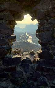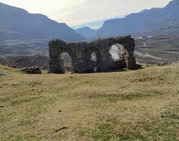 BARBARA-RUINE, „KUCHELEN“ Sie stammen aus dem 6. und 10. Jh. und wir kommen direkt zum höchsten Punkt von Castelfeder, der weithin sichtbaren Ruine der einstigen Barbarakapelle. Viel könnten all diese Mauern erzählen und dankbar sind wir für die vielen Info-Tafeln. Nachdem wir zur anderen Seite zur Fruchtbarkeitsrutsche und den Resten der Ringmauer, den so genannten „Kuchelen“ abgestiegen sind, die uns einen einmaligen Blick ins Etschtal gewähren, geht es wieder hinauf und zur weithin sichtbaren Fahne. In der Nähe entdecken wir Turmreste
